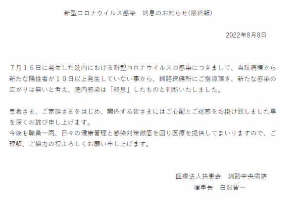 新型コロナウイルス感染 終息のお知らせ(最終報)