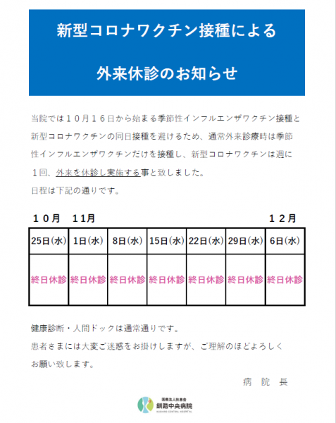 新型コロナワクチン接種による外来休診のお知らせ