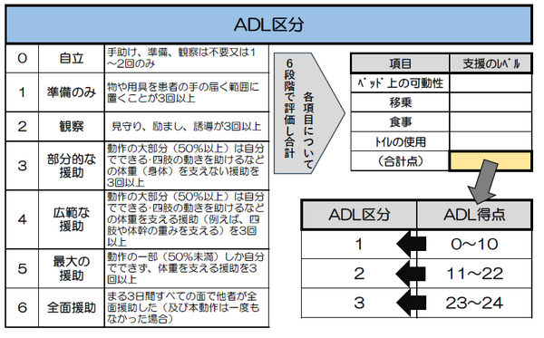 療養病棟では、慢性期の患者さまに対し、日々の医療必要度に応じた「医療区分」および「ADL区分」を包括的(総合的)に評価し、該当し続ける患者さまのみ、長期的に入院が可能となります。