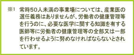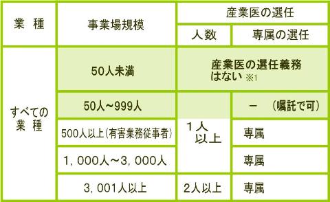 国では、労働安全衛生法により、下記のように産業医の選任を義務付けております。 |
